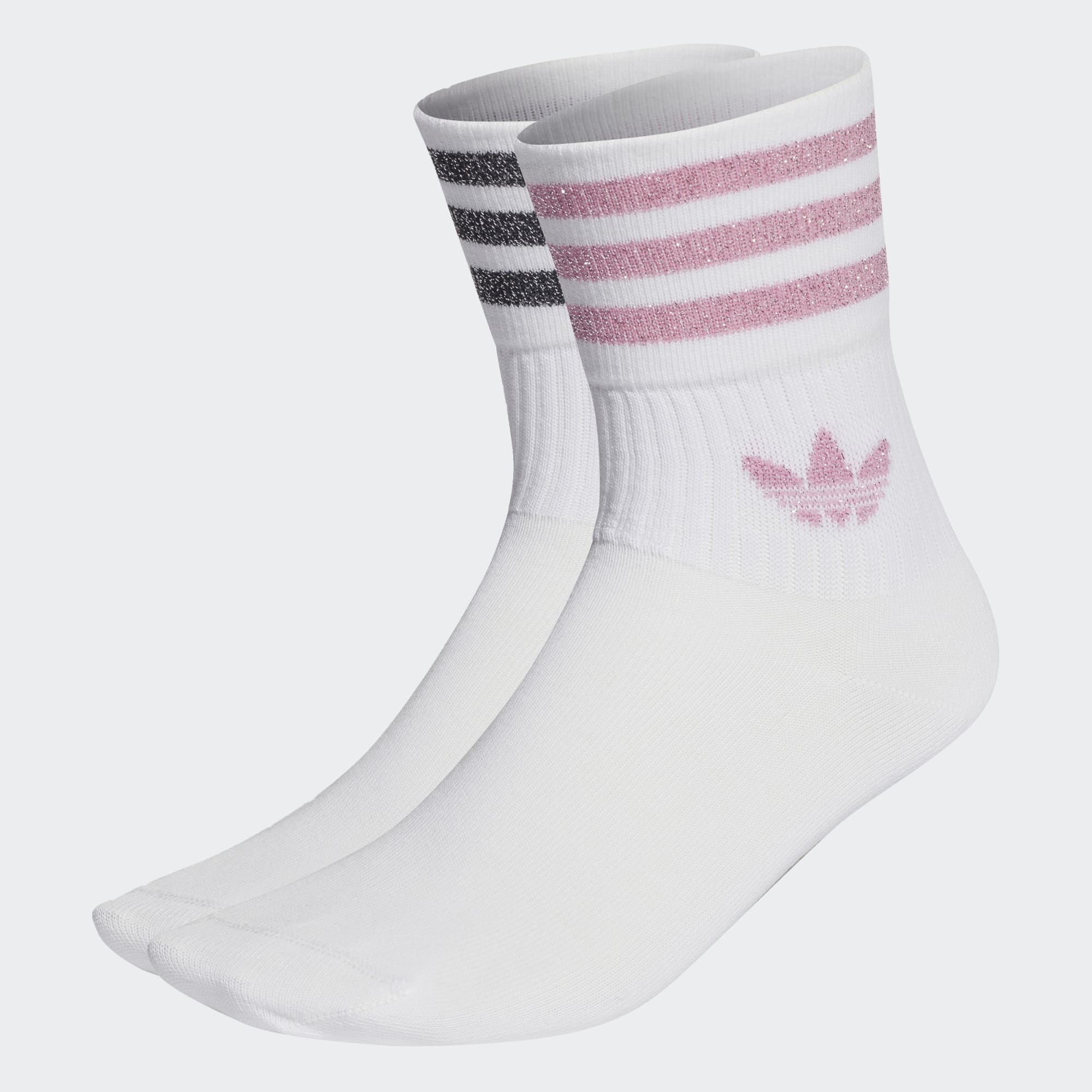 El estilo deportivo se viste de brillo con estos calcetines clásicos para mujer. Lucen el logotipo del trébol y 3 bandas tejidas con purpurina que aportan un toque divertido y femenino a cualquier look.