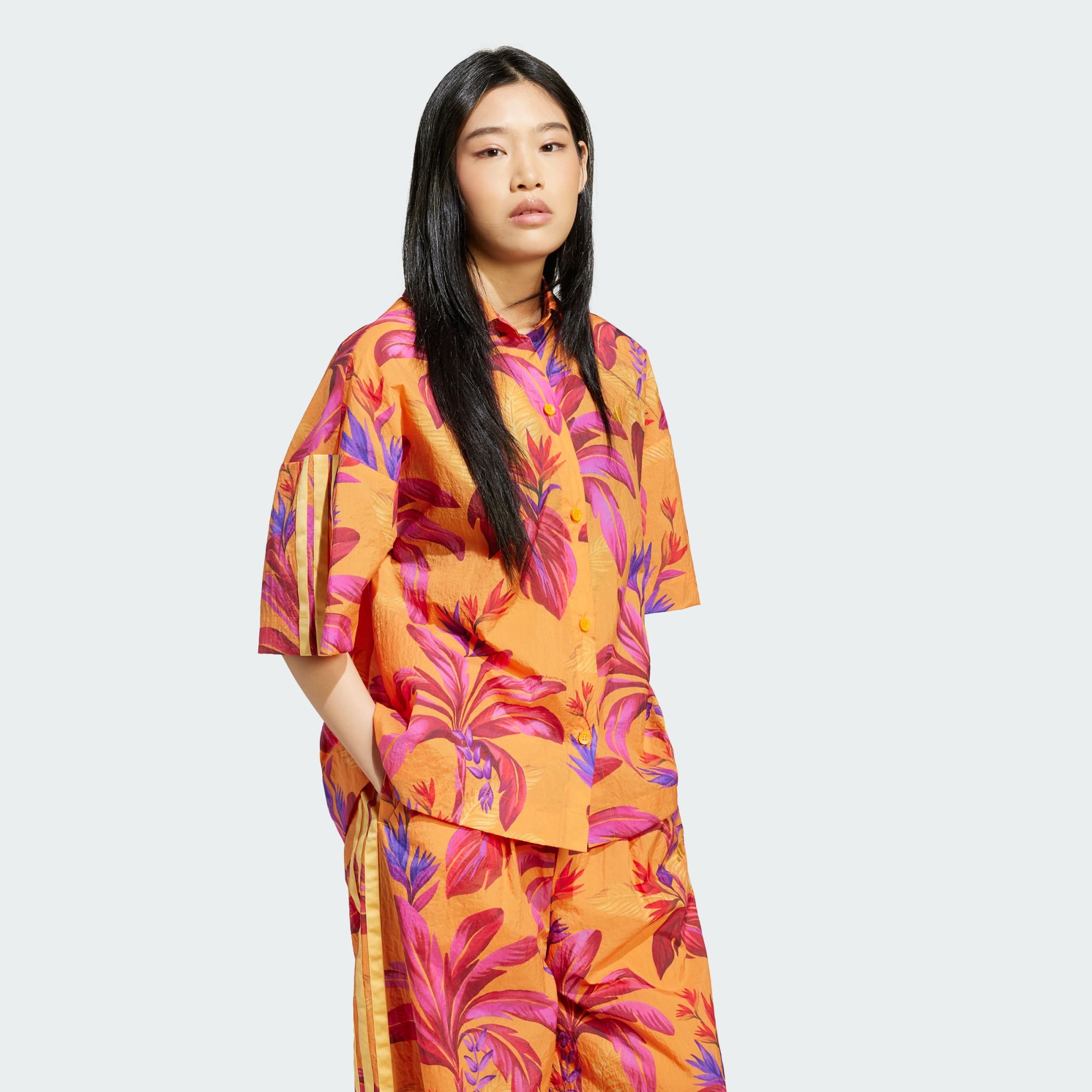 Esta colorida camisa combina el estilo deportivo de adidas con el vibrante espíritu tropical de la firma de moda brasileña FARM Rio. El estampado en toda la prenda evoca la belleza de un oasis desértico, mientras que las 3 bandas en las mangas conservan la esencia de adidas. El cómodo corte holgado y el tejido técnico te ofrecen una total libertad de movimiento. Ya sea para un día de aventuras o simplemente para salir a tomar un café con tus amigos, esta llamativa prenda añade un toque salvaje y atrevido a tus looks. Este producto se ha fabricado con un 100% de materiales reciclados. Utilizando materiales reciclados, reducimos los residuos, nuestra dependencia de los recursos finitos y la huella que generan los productos que fabricamos.