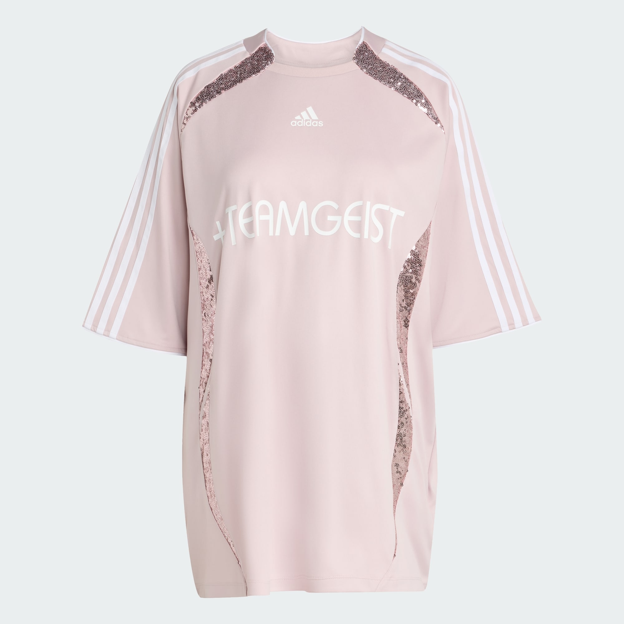 Esta temporada, Adilenium se inspira en la tradición para reimaginar Teamgeist, una icónica línea de fútbol de adidas que revolucionó el terreno de juego. Esta camiseta oversize de ajuste holgado y amplio atrapa la luz con paneles de lentejuelas y una línea de diseño Teamgeist. Está confeccionada con un suave tejido interlock de poliéster brillante y acabada con un estampado metalizado líquido del logotipo de Teamgeist y el logotipo de adidas.