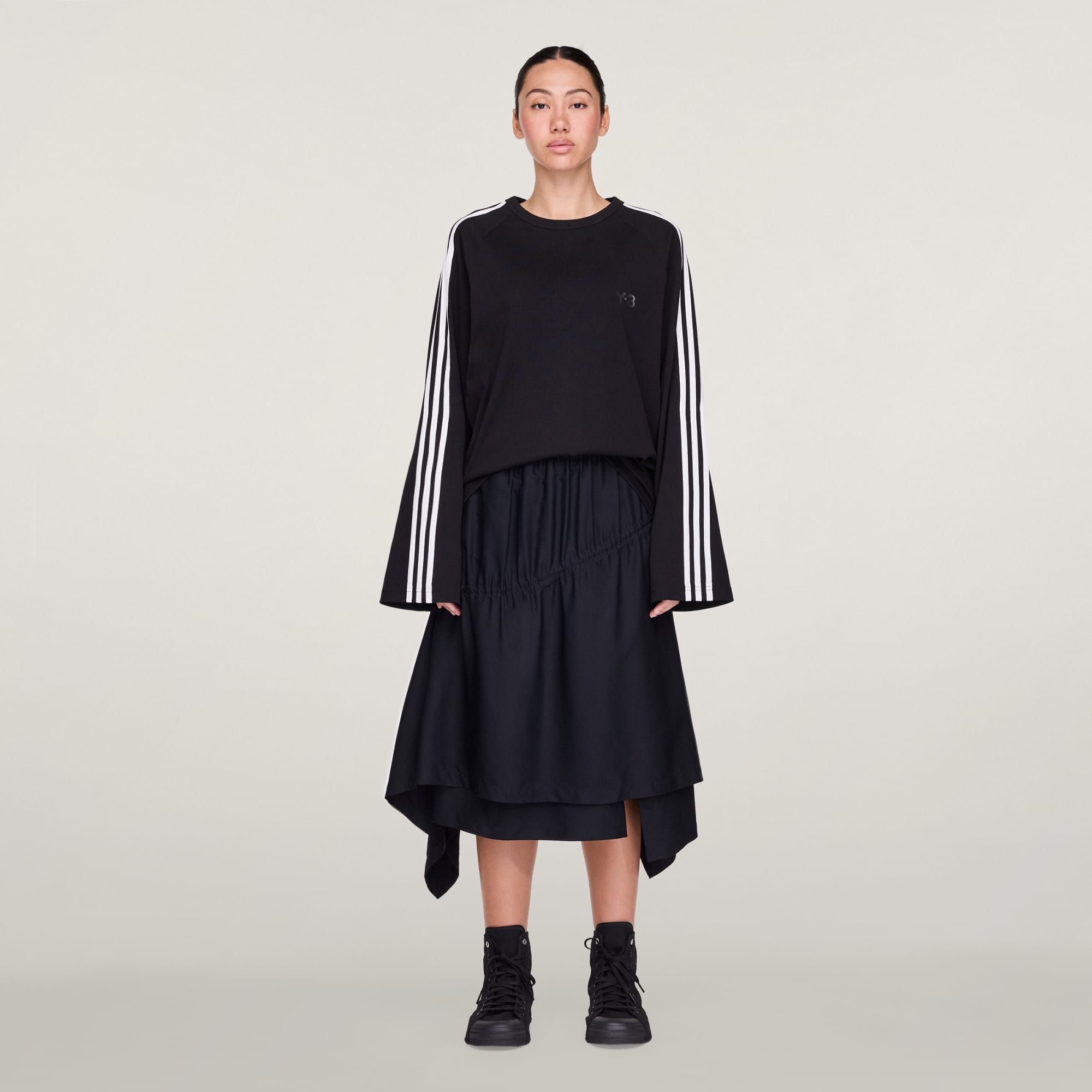No tan clásica, la camiseta manga larga Y-3 3 Stripes está confeccionada en una sublime mezcla de lyocell, nailon y lana de oveja. Las 3 bandas incluyen unos alambres que permiten jugar con la forma.