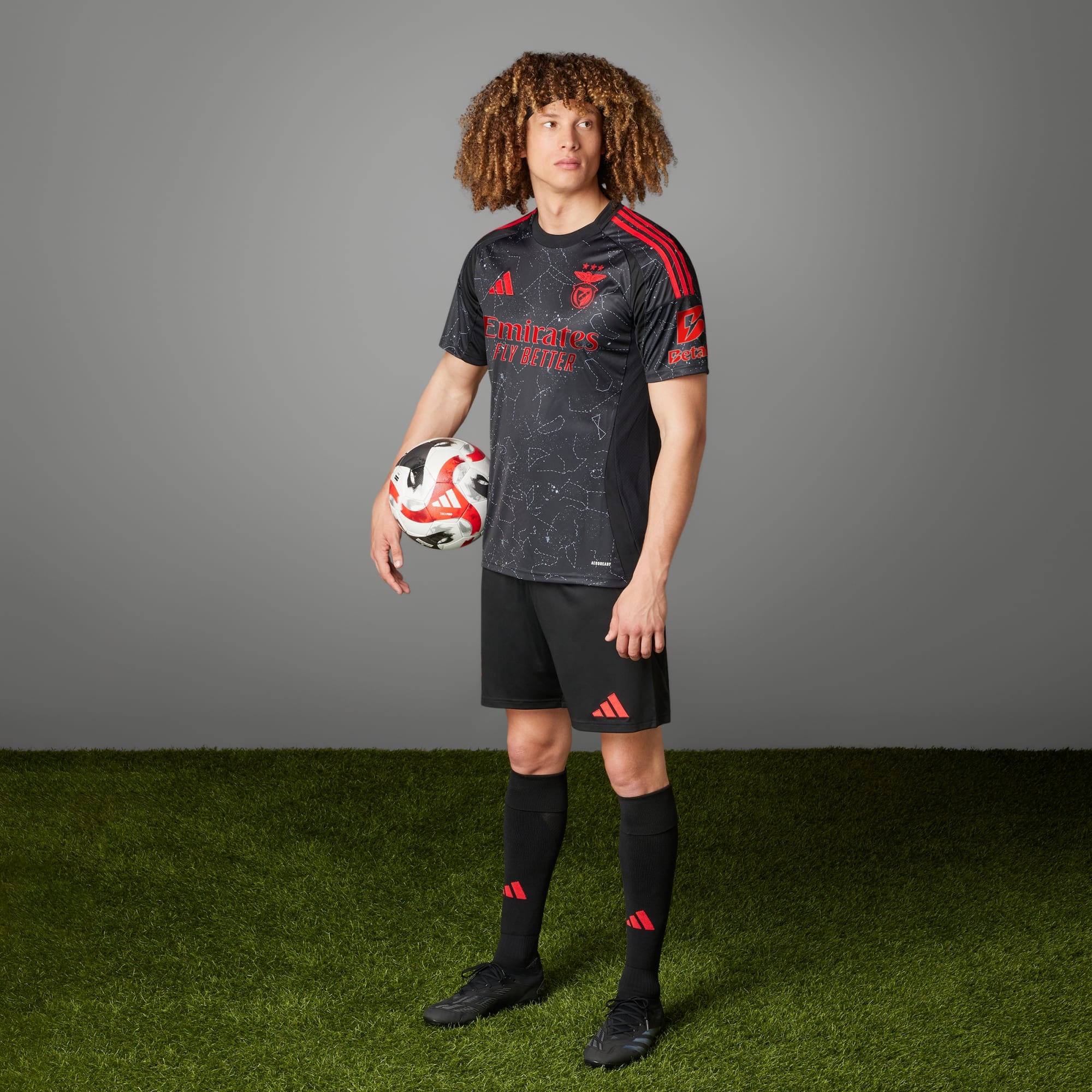 Está escrito en las estrellas. El Benfica celebra este año su 120 aniversario con una camiseta de la segunda equipación que es sencillamente estelar. Su llamativo diseño, inspirado en una noche estrellada, rinde homenaje al cielo plagado de estrellas que iluminó la ciudad de Lisboa en aquel histórico día de su fundación. El tejido transpirable AEROREADY mantiene la piel seca y aporta una gran comodidad a los aficionados del club. Este producto se ha fabricado con materiales 100% reciclados. Utilizando materiales reciclados, reducimos los residuos, nuestra dependencia de los recursos finitos y la huella que generan los productos que fabricamos.