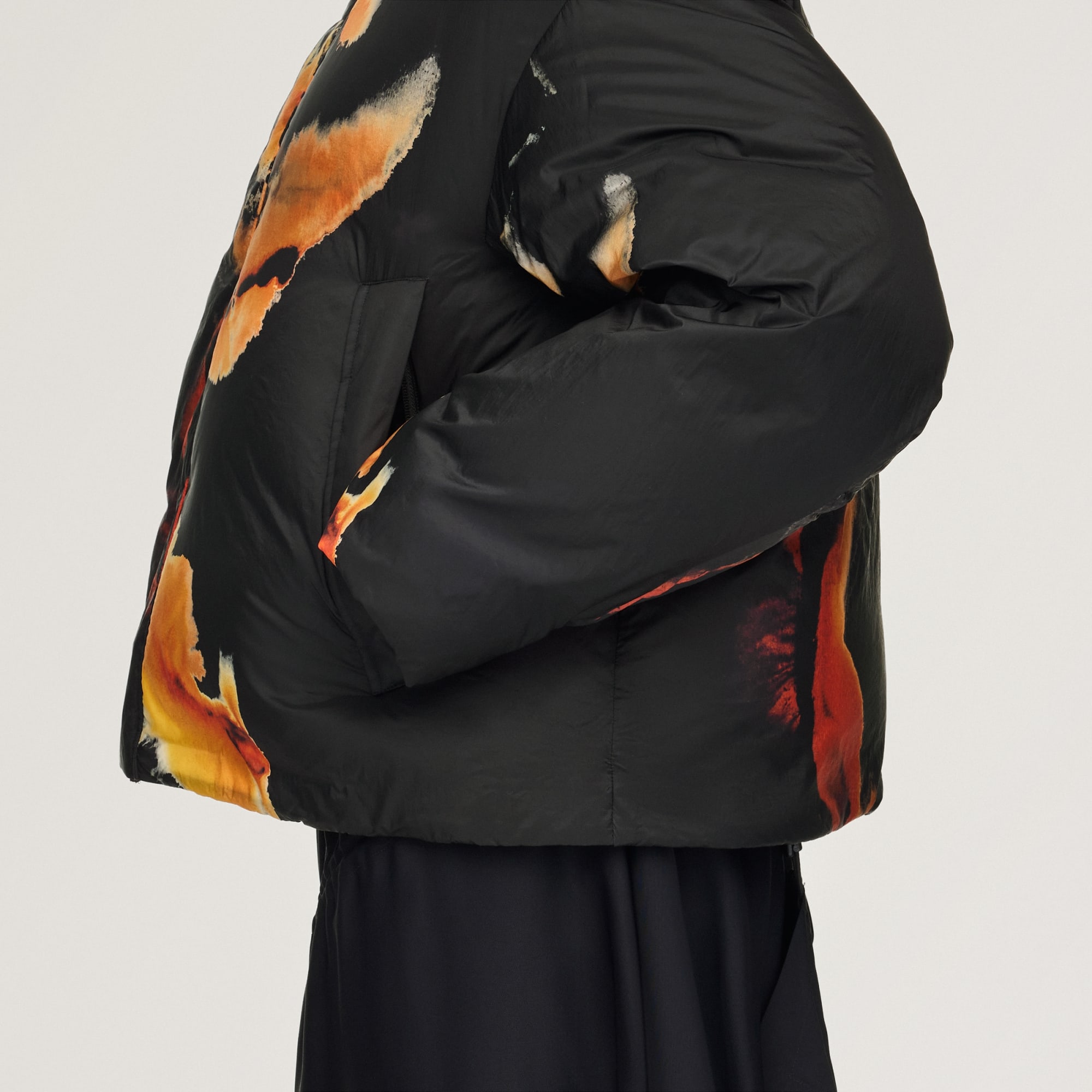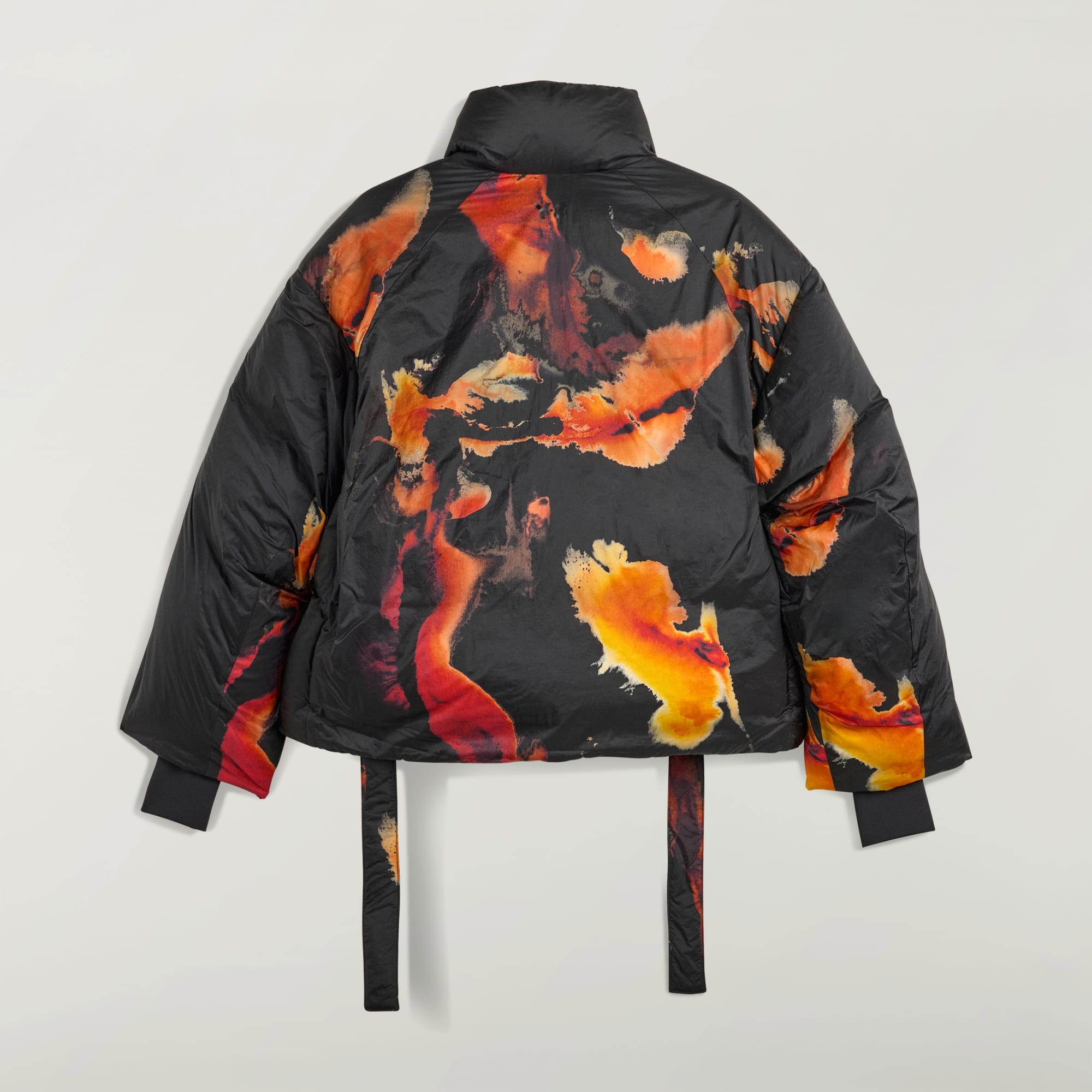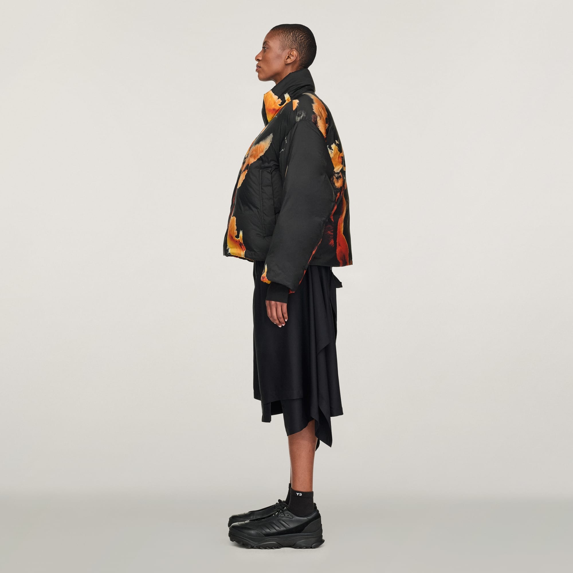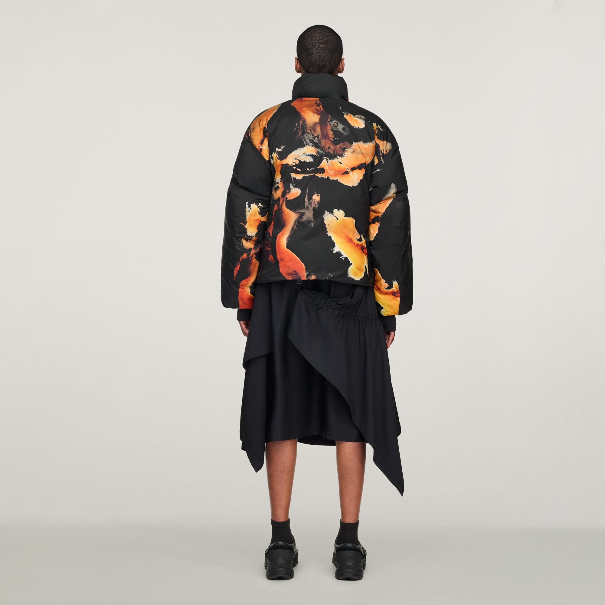 La chaqueta abullonada Y-3 es tan cálida y cómoda como expresiva. La combinación de aislamiento PrimaLoft® y relleno de plumón de pato proporciona una calidez de primera calidad, mientras que su estructura de nailon liso ofrece un aspecto prémium. Inspirado en la tinta ámbar, este exclusivo estampado representa la calidez y la energía, la transformación y la belleza, expresadas a través de su recorrido desde sutiles tonos dorados hasta ricos naranjas y marrones.
