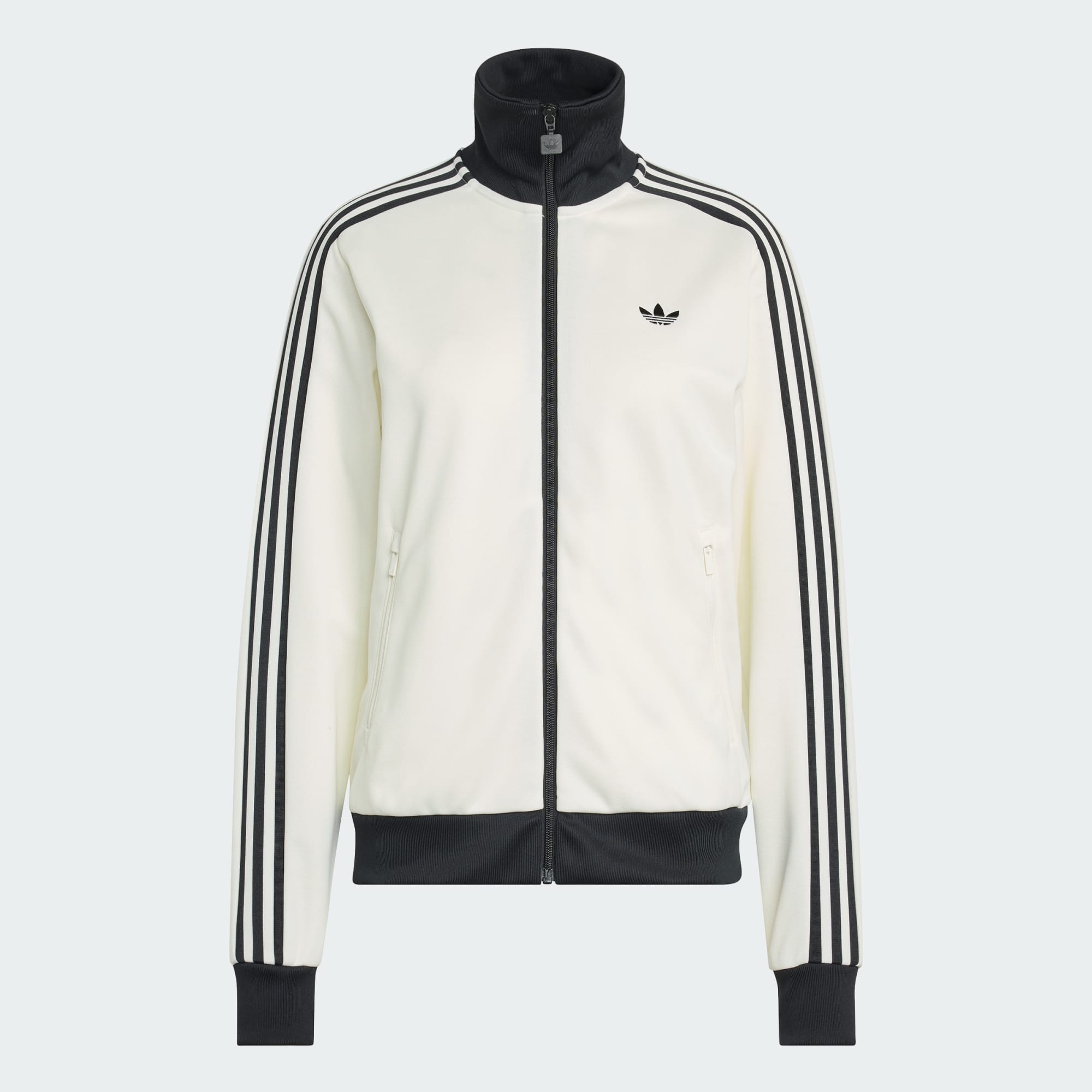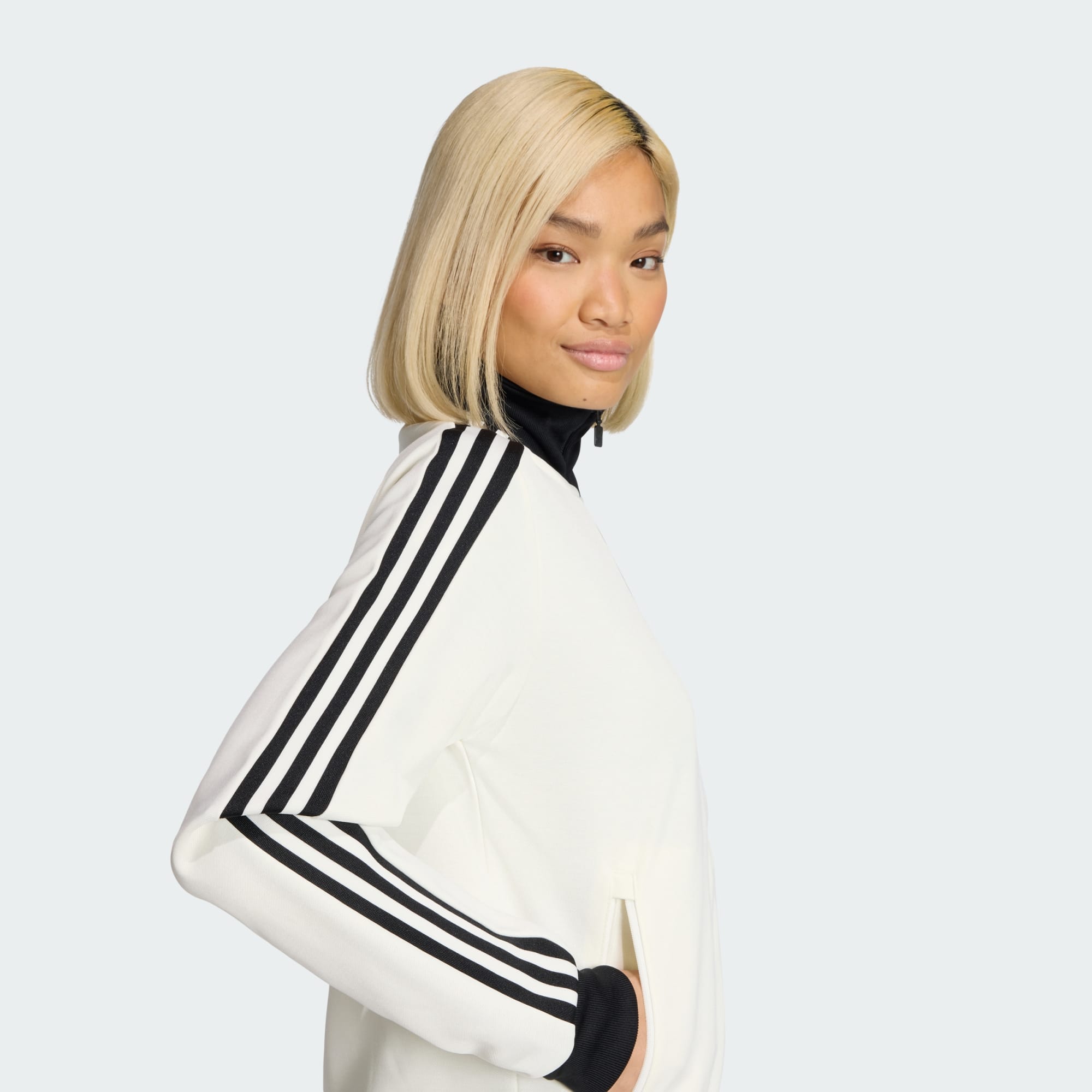 Una silueta deportiva icónica de chaqueta deportiva de cuello chimenea y diseño de 3 Bandas para mayor cobertura y estilo.