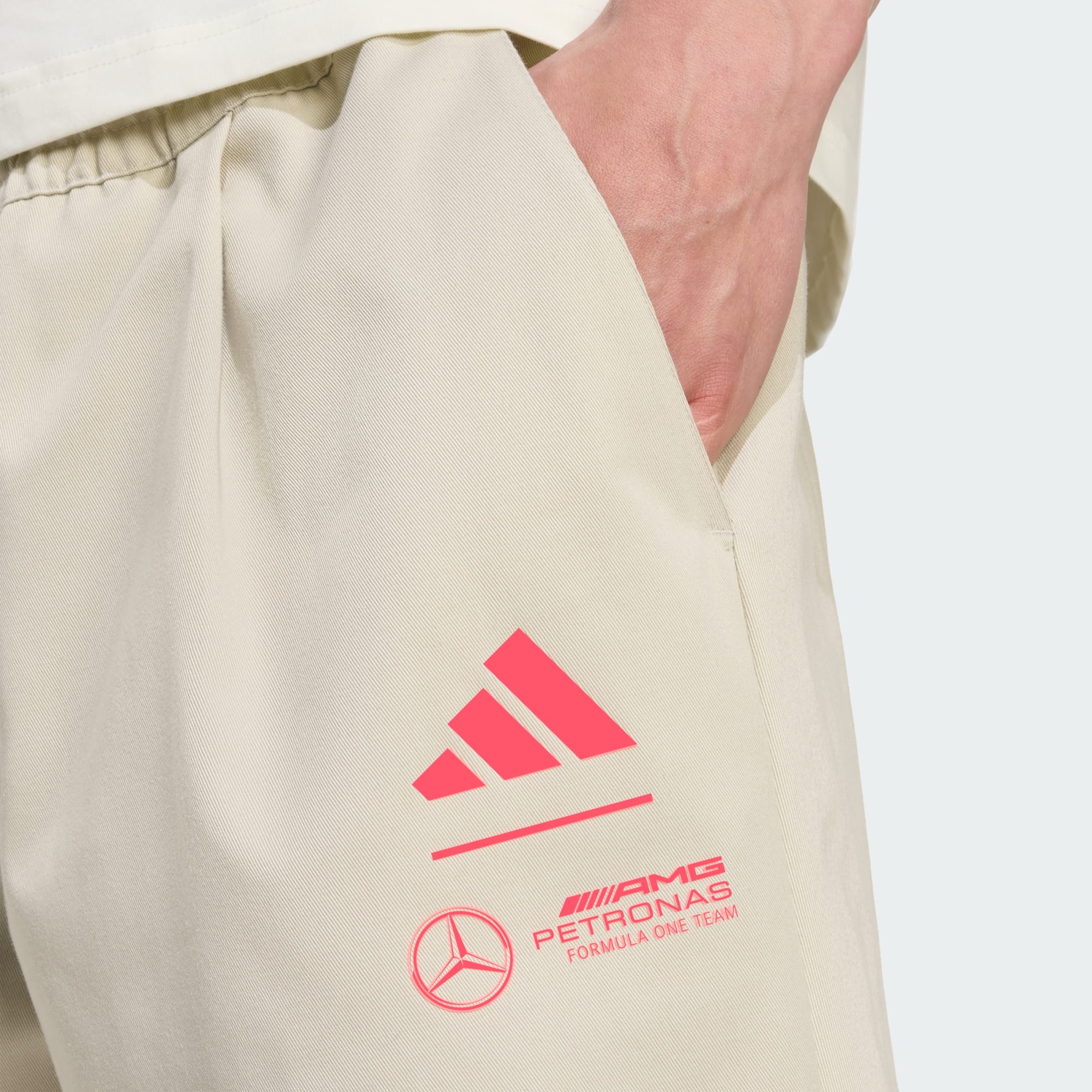 Sube de marcha con este pantalón chino Mercedes - AMG Petronas Formula One Team Summer de adidas Motorsport. Luce el logotipo del equipo en una pernera y presenta una cintura con cordón que te ofrece un ajuste seguro. Se ha confeccionado en un tejido con mezcla de algodón y tejido técnico muy cómodo y resistente al desgaste.