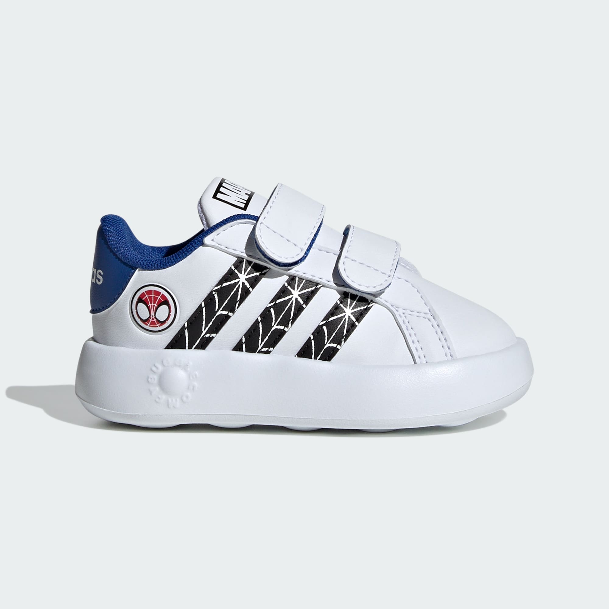 Su nueva compañera de juegos. Esta zapatilla para peques imparables reinventa el icónico estilo tenístico de adidas con una suela extraordinariamente suave. Presenta un empeine de piel sintética con las emblemáticas 3 bandas y detalles inspirados en Spider-Man de Marvel. Las correas autoadherentes le ofrecen un ajuste cómodo y seguro, y a ti te permiten calzarle y descalzarle en un abrir y cerrar de ojos. La mediasuela de EVA de una sola pieza y la suela con dibujo de burbujas proporcionan amortiguación y tracción sin añadir peso innecesario, por lo que es perfecta para que tu peque descubra el mundo paso a paso. Este producto contiene al menos un 20% de materiales reciclados. Utilizando materiales reciclados, reducimos los residuos, nuestra dependencia de los recursos finitos y la huella que generan los productos que fabricamos.