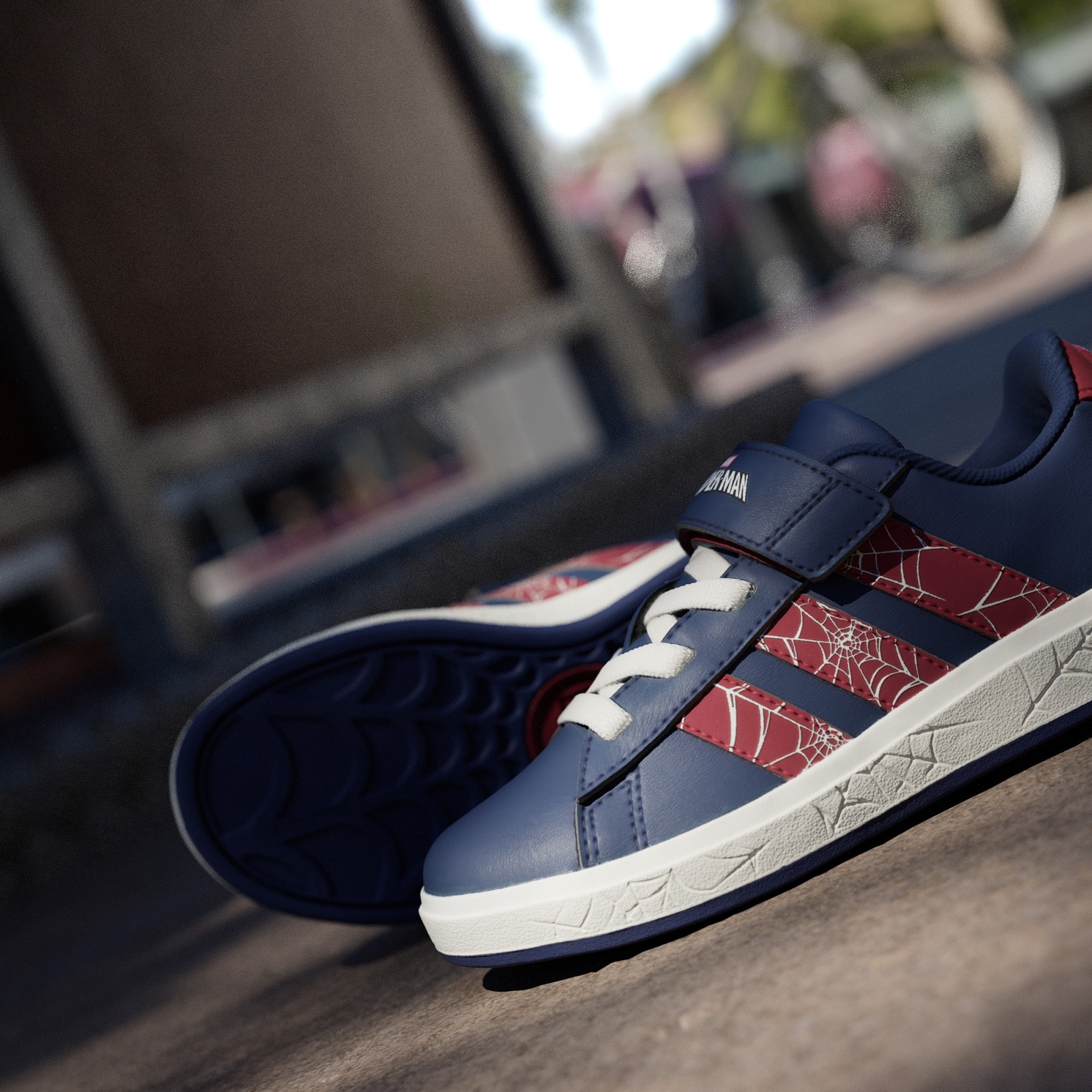 Un perfil clásico de adidas con detalles de Spider-Man y una tira de velcro.