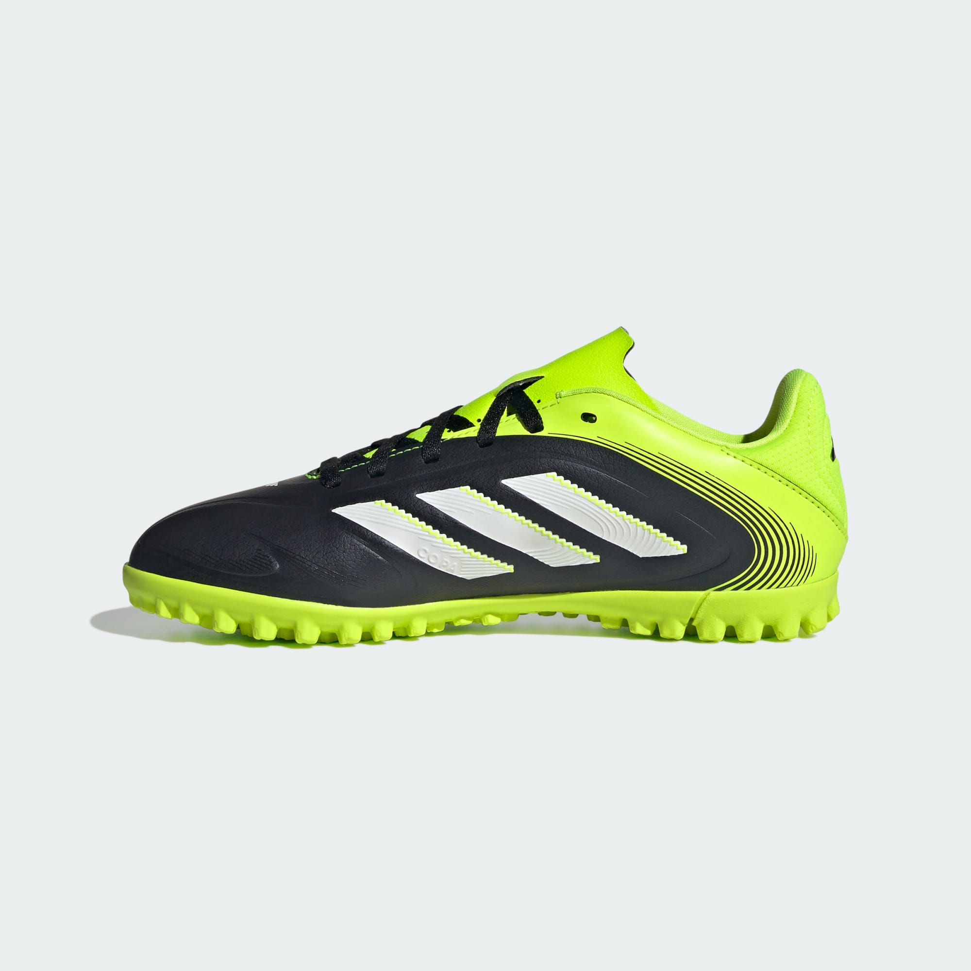 Toques exactos. Pases milimétricos. Perfecciona tu juego con la Bota Copa Pure 3 y consigue una conexión inquebrantable con el balón. Esta bota adidas Club para adolescentes tiene un suave empeine de material sintético y un estampado en relieve en el empeine para un mejor control. La suela de goma con tacos arrasa en superficies de moqueta, para que juegues al fútbol con más clase que nunca.