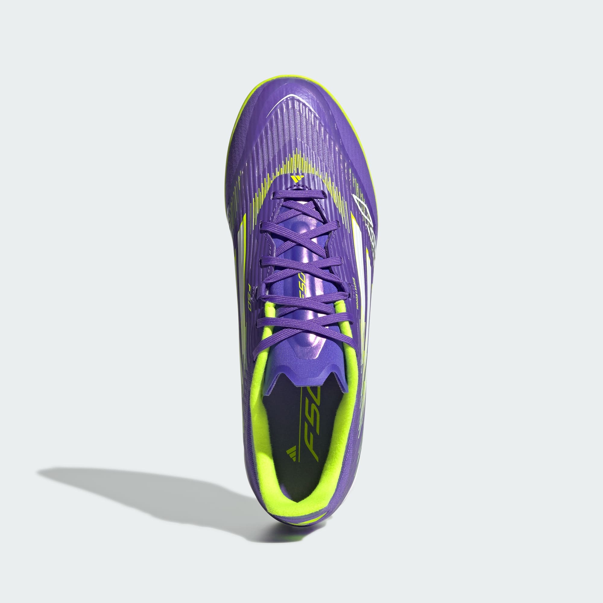 Deja que tu velocidad hable por ti en la pista cubierta. Siente la adrenalina con las botas adidas F50, con diseño imparable. El empeine Fiberskin de esta bota de fútbol League, acabado con un refuerzo de la puntera de ante para mejorar el contacto con el balón, incorpora una lengüeta envolvente que se ajusta al tobillo, ofreciéndote una sujeción imbatible. La suela non-marking rubber outsole te permite alcanzar velocidades sin igual en la pista cubierta.