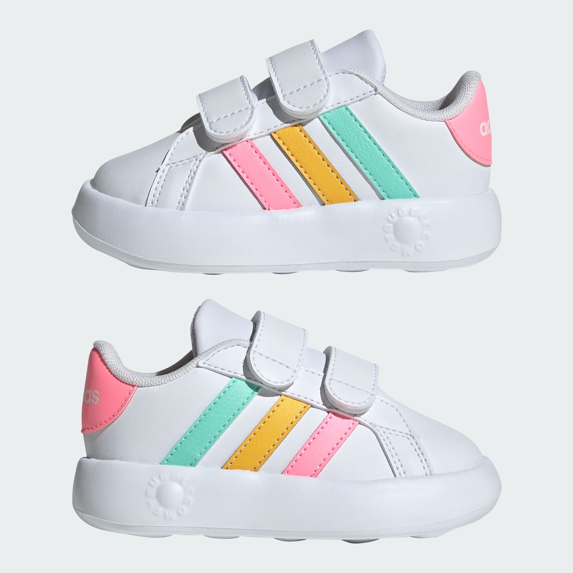 Si tu peque pudiera hablar, te diría cuánto le encanta esta zapatilla Grand Court de adidas. Las correas autoadherentes te permiten calzarle y descalzarle fácilmente, mientras que la suela de EVA con efecto burbuja le ofrece una pisada más cómoda. Ya sea para gatear o dar sus primeros pasos, sus divertidos colores y las clásicas 3 bandas le animarán a jugar durante todo el día.