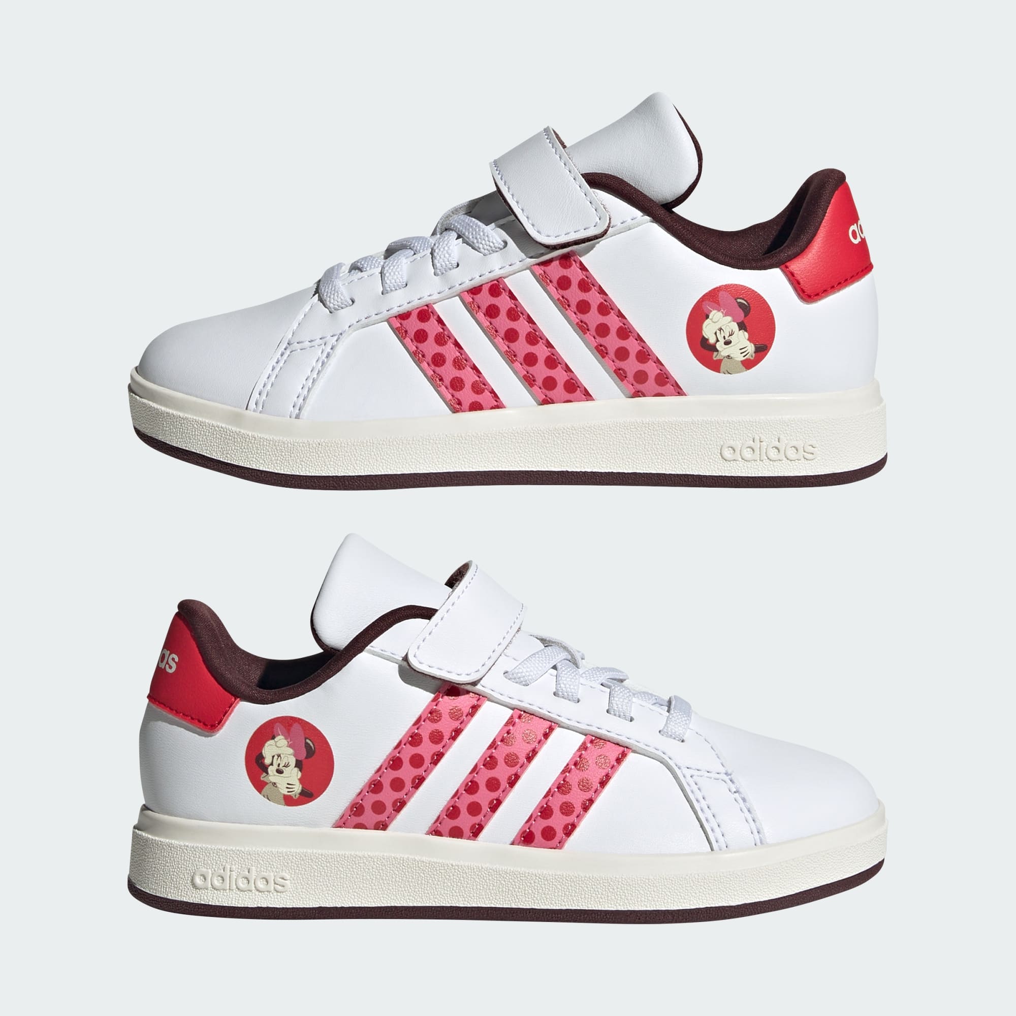 Un look clásico con un toque divertido. Esta zapatilla para peques incansables se inspira en el mítico diseño Grand Court de adidas y lo actualiza con 3 bandas con lunares y un adorable estampado de Minnie Mouse. La mediasuela y la suela de EVA suave le ofrecen una pisada más cómoda y una gran estabilidad mientras explora el mundo que le rodea. Los cordones elásticos y la correa autoadherente le permiten calzarse y descalzarse fácilmente, ya sea para jugar en el parque o para ver su película favorita de Disney en casa. Este producto contiene al menos un 20% de materiales reciclados. Utilizando materiales reciclados, reducimos los residuos, nuestra dependencia de los recursos finitos y la huella que generan los productos que fabricamos.